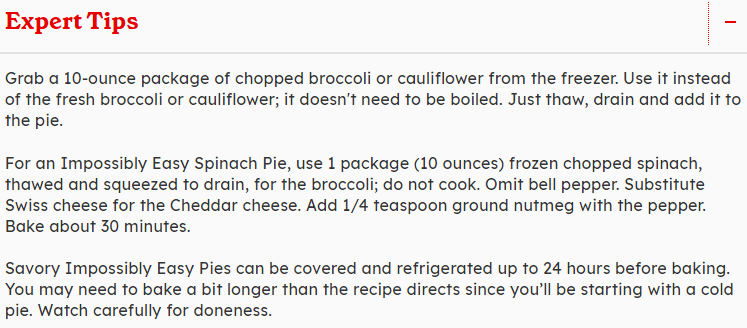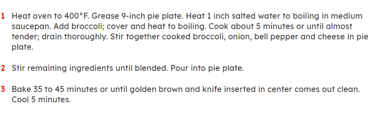 Uncategorized Easy Vegetable Pie Posted on August 19, 2021 by regalbeagleonline Ingredients 2cups chopped fresh broccoli or sliced fresh cauliflowerets1/3cup chopped onion1/3cup chopped green bell pepper1cup shredded Cheddar cheese (4 ounces)1/2cup Original Bisquick™ mix1cup milk1/2teaspoon salt1/4teaspoon pepper2eggs Share this: Click to share on X (Opens in new window) X Click to share on Facebook (Opens in new window) Facebook Like Loading... Related