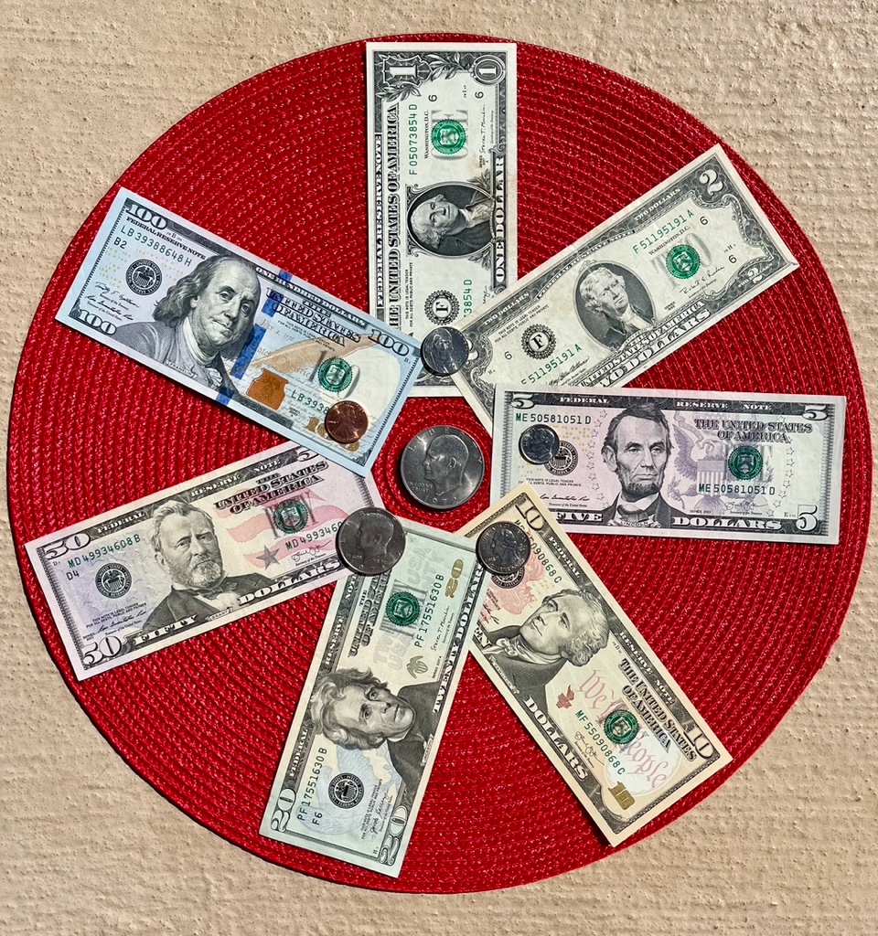 Photo taken of US currency which features 8 different Presidents and 2 founding fathers. Which 3 are featured on paper currency and coins. Do you know which two were not presidents?