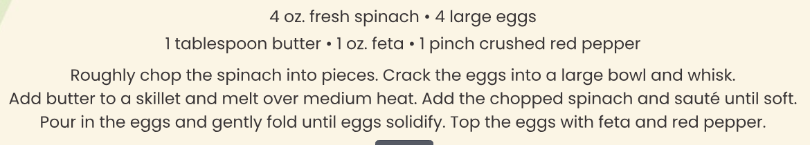 Uncategorized Scrambled Eggs with Spinach and Feta Posted on May 30, 2024 by regalbeagleonline Share this: Click to share on X (Opens in new window) X Click to share on Facebook (Opens in new window) Facebook Like Loading... Related