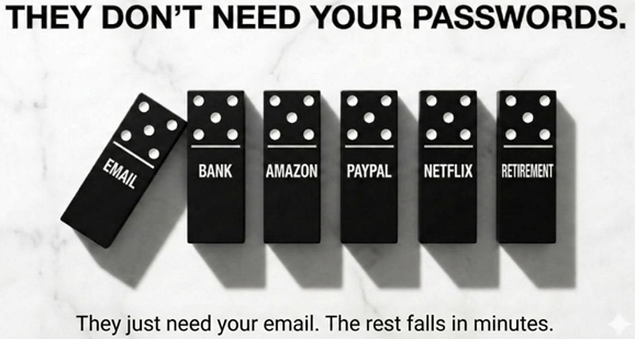 | A criminal doesn’t need to hack your bank. They just need your inbox. One account. Every other door swings wide open. That’s not a flaw. That’s how email was designed to work. And most people protect it with the same password they’ve used for years and years. |